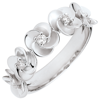 En una corona de flores resplandecientes, los pétalos se abren sobre un corazón de diamantes, capturando un momento para la eternidad. . Podrá ser llevada como una sortija o como una alianza excepcional.