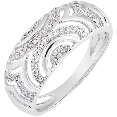 Un anillo curvado y calado, con motivos art deco empedrados en diamantes, que revisita con equilibrio los códigos del estilo retro. Una gracia atemporal.