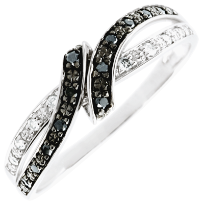 Metal en un movimiento fluido que nos hechiza bajo el brillo de los diamantes y pone de relieve el contraste del blanco del oro y el negro de los diamantes.
