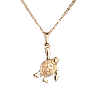 Un bebe tortuga en plena carrera hacía el mar. Su caparazón es de oro amarillo rugoso y adornado con un diamante.