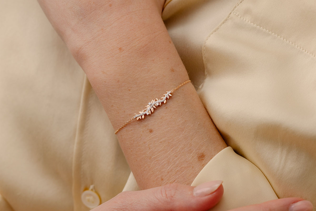 Hojas de oro rosa brillantes y hojas de oro de acabado rugoso hechas a mano se alternan para crear una pulsera romántica con 7 diamantes. Pulsera de longitud ajustable: 18 cm, 17 cm, 16 cm. Motivo de 30 mm de largo y 5 mm de alto.