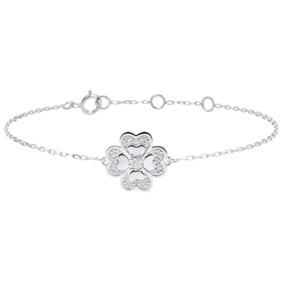 Una pulsera moderna con 4 hojas resplandecientes posadas entorno a un diamante central de oro blanco pulido, así como sus motivos florales de oro.