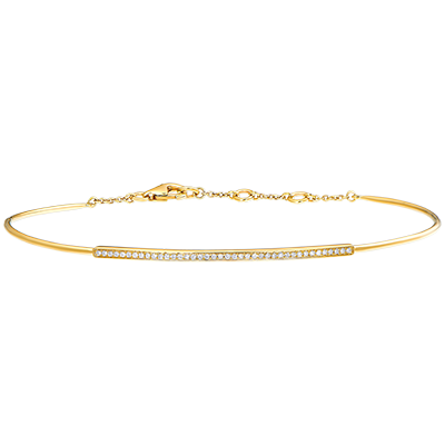 Un delicado junco de oro amarillo engastado con una pléyade de 40 diamantes para iluminar la muñeca. Brazalete con cierre de cadena para mayor comodidad.