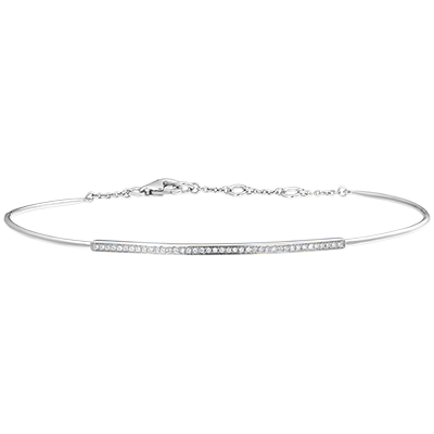 Un delicado junco de oro blanco engastado con una pléyade de 40 diamantes para iluminar la muñeca. Brazalete con cierre de cadena para mayor comodidad.