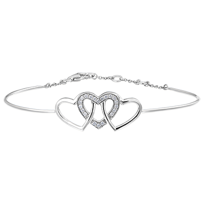 Un Brazalete de junco en donde el trío de corazones se entrelaza con delicadeza, ternura y encanto, en oro blanco y recubierto de diamantes. Brazalete con cierre de cadena para mayor comodidad.