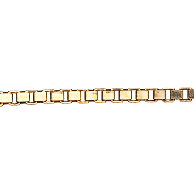 La cadena veneciana, compuesta por pequeños cubos encadenados, crea un destello único alrededor de su cuello. El oro moldeado de este modo da lugar a una de las cadenas más bellas.