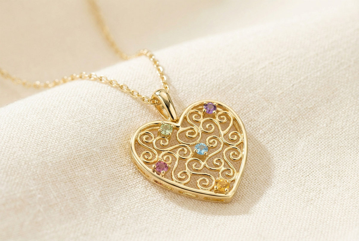 Un encaje de oro sembrado de piedras de color forma el corazón de oro.
