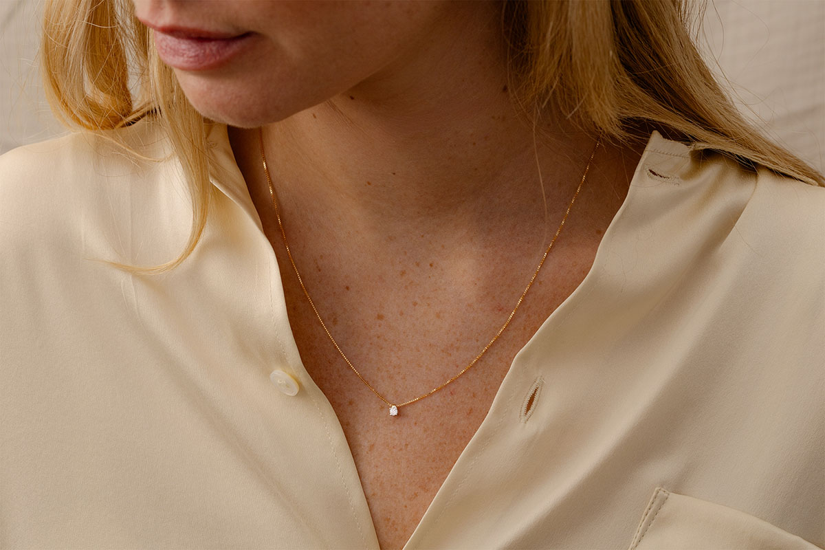 Esta joya realza el brillo natural del diamante con un diseño minimalista y sofisticado, perfecto para cualquier ocasión.