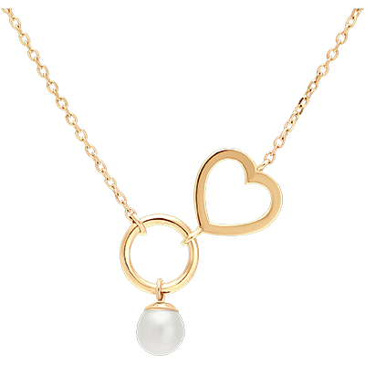 Un collar de oro amarillo adornado con un anillo, una perla y un colgante de corazón, para un diseño lleno de movimiento y ligereza.