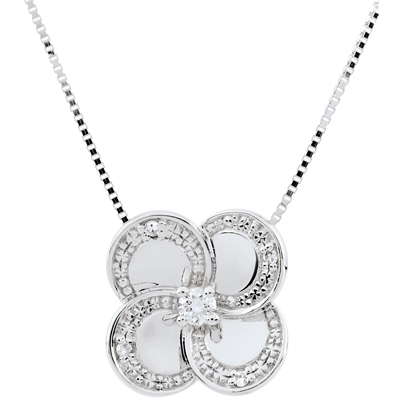 Un trébol moderno de 4 hojas al cuál sus caras de oro pulido y contornos de diamantes confieren un gran brillo.