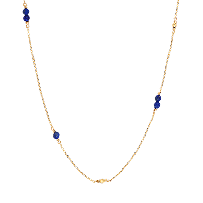 Seis perlas de lapislázuli de intenso azul acentúan delicadamente la cadena. Los segmentos con dos perlas miden 12,2 mm; los de una sola perla, 9 mm, dibujando un ritmo sutil y equilibrado.Una joya como una constelación azulada: sutil y luminosa sobre la piel.