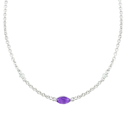 La preciosa pupila simbolizada por un amatista de corte marquesa coronado en el centro de esta fina cadena de oro blanco. Está rodeado por dos diamantes magníficos como dos lágrimas congeladas para siempre.