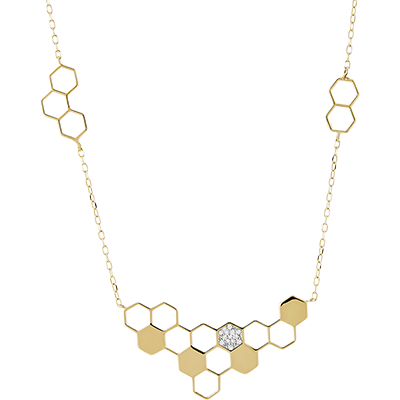 El collar Revelación , sutilmente irregular, está compuesto por celdillas de oro finamente trabajadas, rellenas de oro y adornadas con 13 diamantes brillantes como una poesía. Su cadena también está delicadamente adornada con varias celdillas de oro.