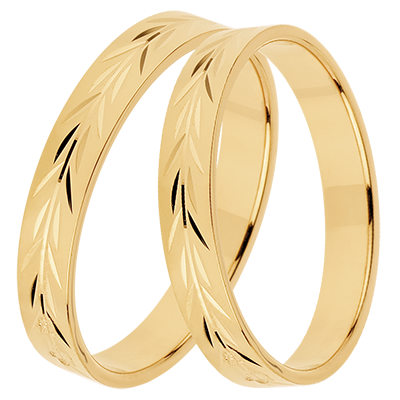 Un elegante par de alianzas de oro amarillo, delicadamente grabadas con un motivo vegetal refinado. El símbolo perfecto para celebrar vuestra unión con distinción.