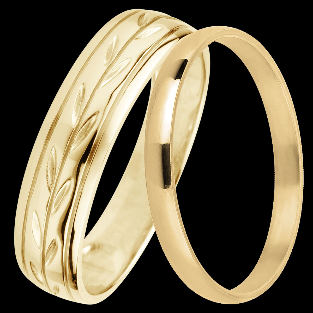 Una elegante pareja de alianzas para ella & él. Una alianza de 2 mm pulida para ella, y una alianza ancha de oro amarillo grabada con hojas eternas para él.