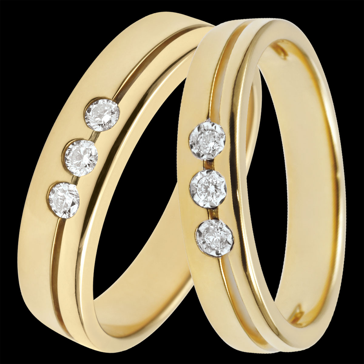 Una elegante pareja de alianzas en oro amarillo, engastadas con una trilogía de diamantes brillantes. La esencia de la sofisticación de Edenly, para celebrar el lujo y la unión eterna.