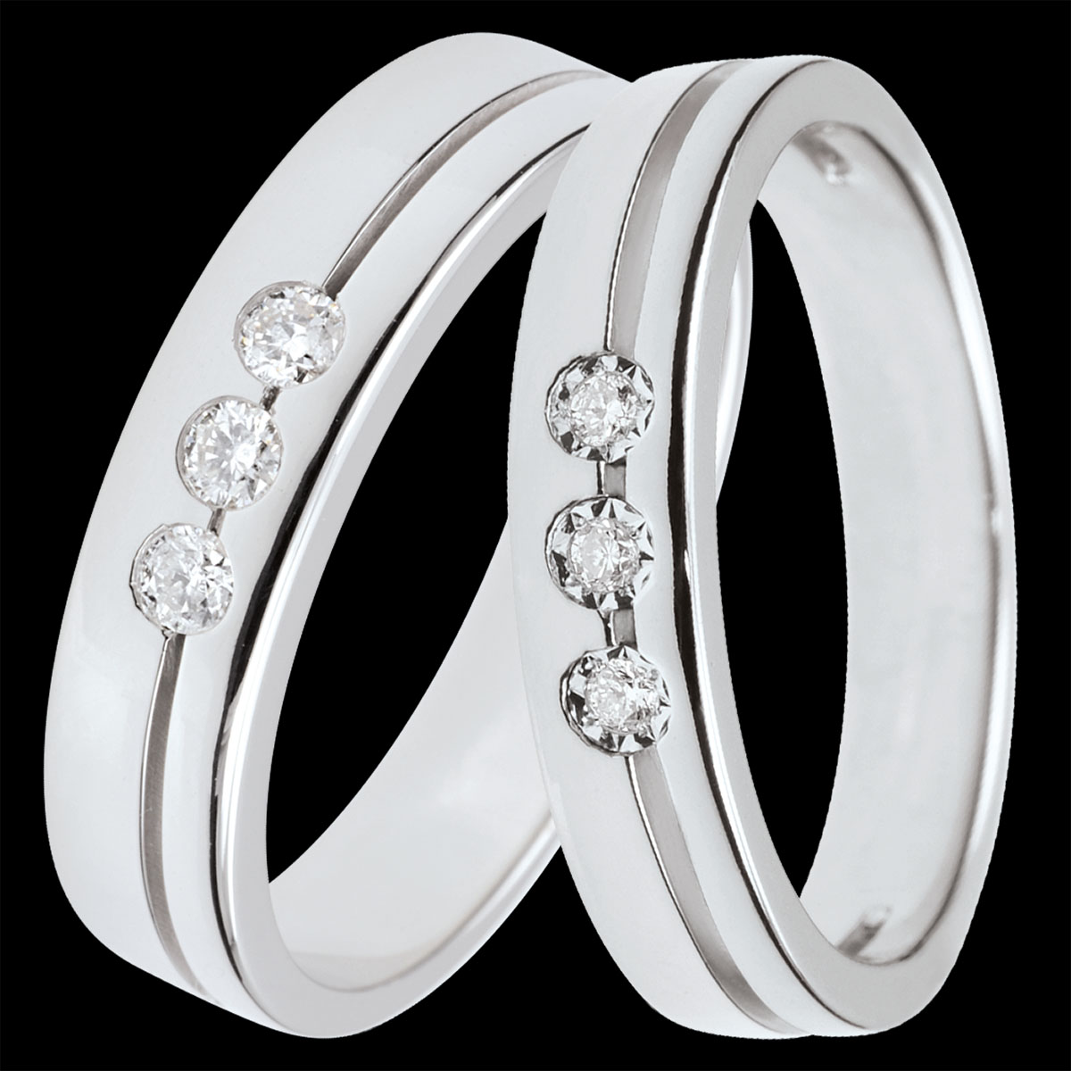 Una elegante pareja de alianzas en oro blanco, engastadas con una trilogía de diamantes: símbolo refinado de unión y amor eterno.