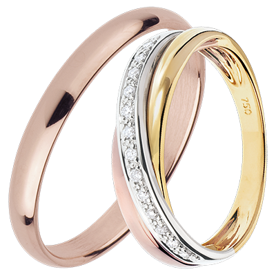 Un elegante par de alianzas para ella & él. Para ella, la equilibrada combinación de tres oros, realzada con un pavé de diamantes sobre oro blanco. Para él, un anillo de oro rosa de 2,5 mm, sobrio y refinado.