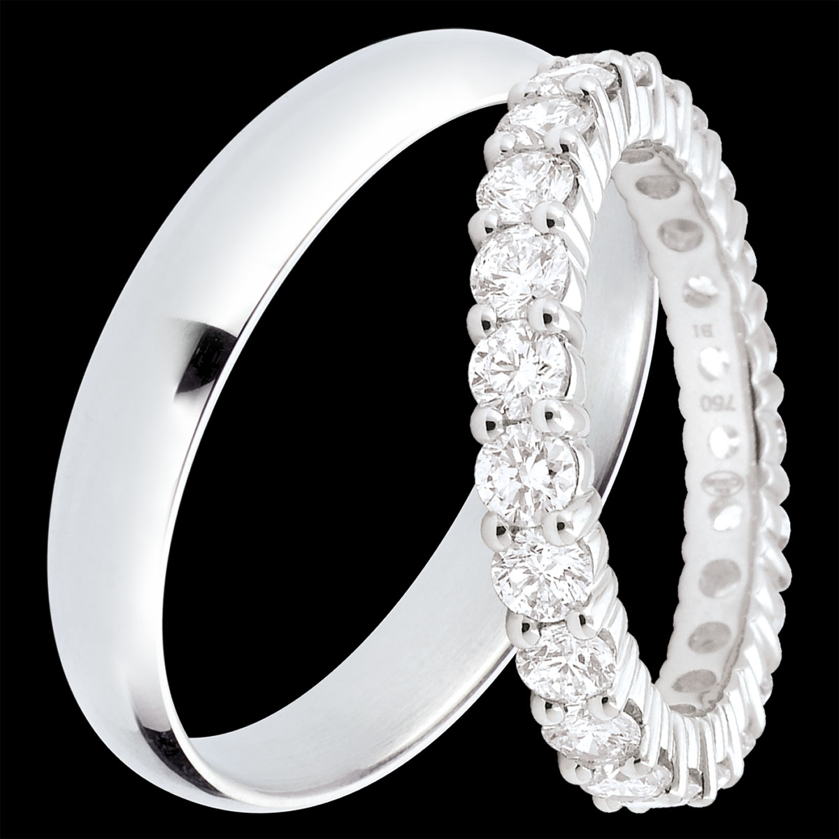 Un elegante par de alianzas para ella y él. Para ella: un anillo de eternidad con engaste de garras y 29 diamantes redondos, sumando 1,11 quilates. Para él: una alianza de oro amarillo pulido de 4 mm. Un símbolo perfecto de vuestro amor.