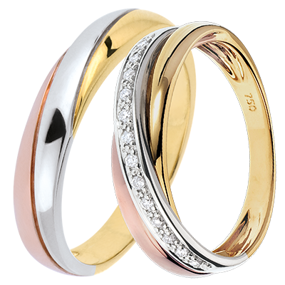 Un elegante par de alianzas para él y ella. La equilibrada combinación de los tres oros está realzada por un pavé de diamantes en oro blanco para ella, mientras que él luce una versión íntegramente en tres oros.