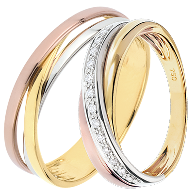Un elegante dúo de alianzas para ella & él. Para ella, la perfecta armonía de los tres oros realzada por diamantes engastados sobre oro blanco. Para él, una trilogía de anillos entrelazados en tres oros.