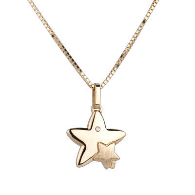 Una gran estrella lleva a otra pequeña. Un diamante adorna uno de sus brazos en oro amarillo. Un gran modelo.