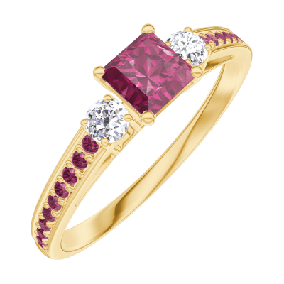 « L'ATELIER » Nº160729Anillo Oro amarillo 18 quilates - Rubí Princesa 0.3 quilates - Piedras laterales Diamante - Engastado Rubí