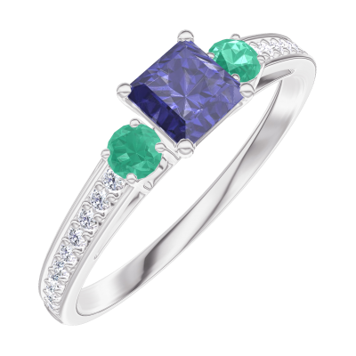 « L'ATELIER » N.º 161388Anillo Oro blanco 9 quilates - Zafiro azul Princesa 0.3 quilates - Piedras laterales Esmeralda - Engastado Diamante