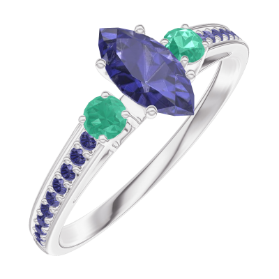 « L'ATELIER » N.º 161795Anillo Oro blanco 18 quilates - Zafiro azul Marquesa 0.3 quilates - Piedras laterales Esmeralda - Engastado Zafiro azul