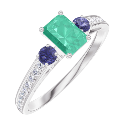 « L'ATELIER » Nº162068Anillo Oro blanco 9 quilates - Esmeralda Rectángulo 0.3 quilates - Piedras laterales Zafiro azul - Engastado Diamante