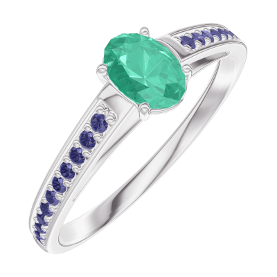 Anillo Oro blanco 18 quilates - Esmeralda Ovalo 0.3 quilates - Engastado Zafiro azul