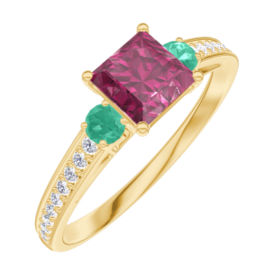 « L'ATELIER » N.º 163186Anillo Oro amarillo 9 quilates - Rubí Princesa 0.5 quilates - Piedras laterales Esmeralda - Engastado Diamante
