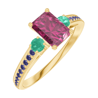 « L'ATELIER » Nº163293Anillo Oro amarillo 18 quilates - Rubí Rectángulo 0.5 quilates - Piedras laterales Esmeralda - Engastado Zafiro azul
