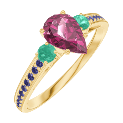 « L'ATELIER » Nº163493Anillo Oro amarillo 18 quilates - Rubí Pera 0.5 quilates - Piedras laterales Esmeralda - Engastado Zafiro azul