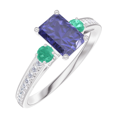 « L'ATELIER » Nº163887Anillo Oro blanco 18 quilates - Zafiro azul Rectángulo 0.5 quilates - Piedras laterales Esmeralda - Engastado Diamante