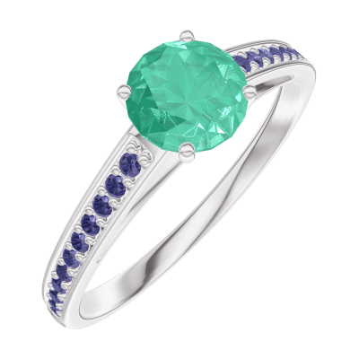 Anillo Oro blanco 18 quilates - Esmeralda Redondo 0.5 quilates - Engastado Zafiro azul