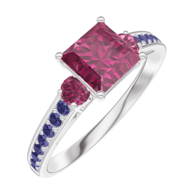 « L'ATELIER » N.º 165555Anillo Oro blanco 18 quilates - Rubí Princesa 0.7 quilates - Piedras laterales Rubí - Engastado Zafiro azul