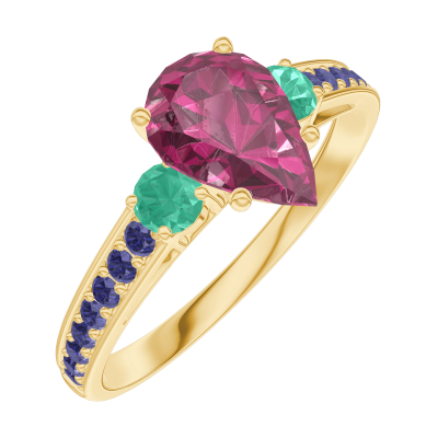 « L'ATELIER » Nº165893Anillo Oro amarillo 18 quilates - Rubí Pera 0.7 quilates - Piedras laterales Esmeralda - Engastado Zafiro azul