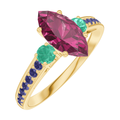 « L'ATELIER » Nº165993Anillo Oro amarillo 18 quilates - Rubí Marquesa 0.7 quilates - Piedras laterales Esmeralda - Engastado Zafiro azul