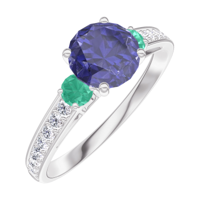 « L'ATELIER » N.º 166088Anillo Oro blanco 9 quilates - Zafiro azul redondo 0.7 quilates - Piedras laterales Esmeralda - Engastado Diamante 4.9 (7)