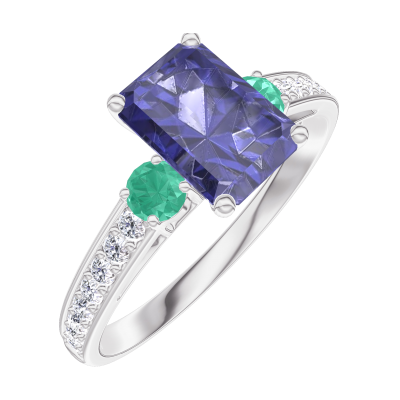 « L'ATELIER » Nº166287Anillo Oro blanco 18 quilates - Zafiro azul Rectángulo 0.7 quilates - Piedras laterales Esmeralda - Engastado Diamante