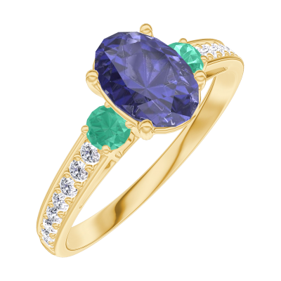 « L'ATELIER » N.º 166386Anillo Oro amarillo 9 quilates - Zafiro azul Ovalo 0.7 quilates - Piedras laterales Esmeralda - Engastado Diamante