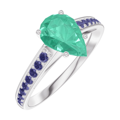 Anillo Oro blanco 18 quilates - Esmeralda Pera 0.7 quilates - Engastado Zafiro azul