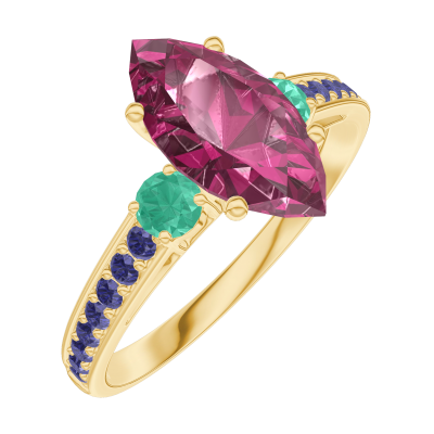 « L'ATELIER » Nº168393Anillo Oro amarillo 18 quilates - Rubí Marquesa 1 quilates - Piedras laterales Esmeralda - Engastado Zafiro azul