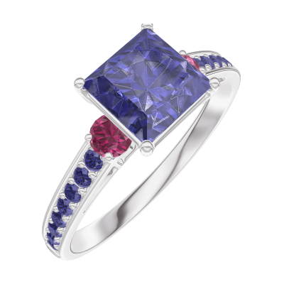 « L'ATELIER » N.º 168555Anillo Oro blanco 18 quilates - Zafiro azul Princesa 1 quilates - Piedras laterales Rubí - Engastado Zafiro azul
