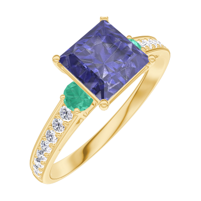 « L'ATELIER » N.º 168586Anillo Oro amarillo 9 quilates - Zafiro azul Princesa 1 quilates - Piedras laterales Esmeralda - Engastado Diamante