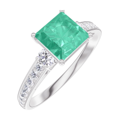 Anillo Oro blanco 18 quilates - Esmeralda Princesa 1 quilates - Piedras laterales Diamante - Engastado Diamante