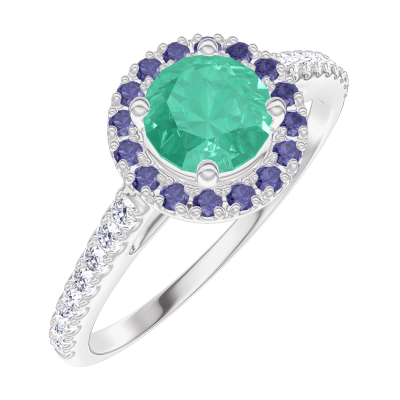 « L'ATELIER » N.º 170904Anillo Oro blanco 9 quilates - Esmeralda redondo 0.5 quilates - Halo Zafiro azul - Engastado Diamante 4.7