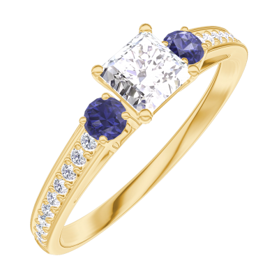 « L'ATELIER » N.º 180166Anillo Oro amarillo 9 quilates - Diamante de laboratorio Princesa 0.3 quilates - Piedras laterales Zafiro azul - Engastado Diamante de laboratorio