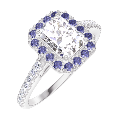 « L'ATELIER » Nº190136Anillo Oro blanco 9 quilates - Diamante de laboratorio Rectángulo 0.5 quilates - Halo Zafiro azul - Engastado Diamante de laboratorio 4.7